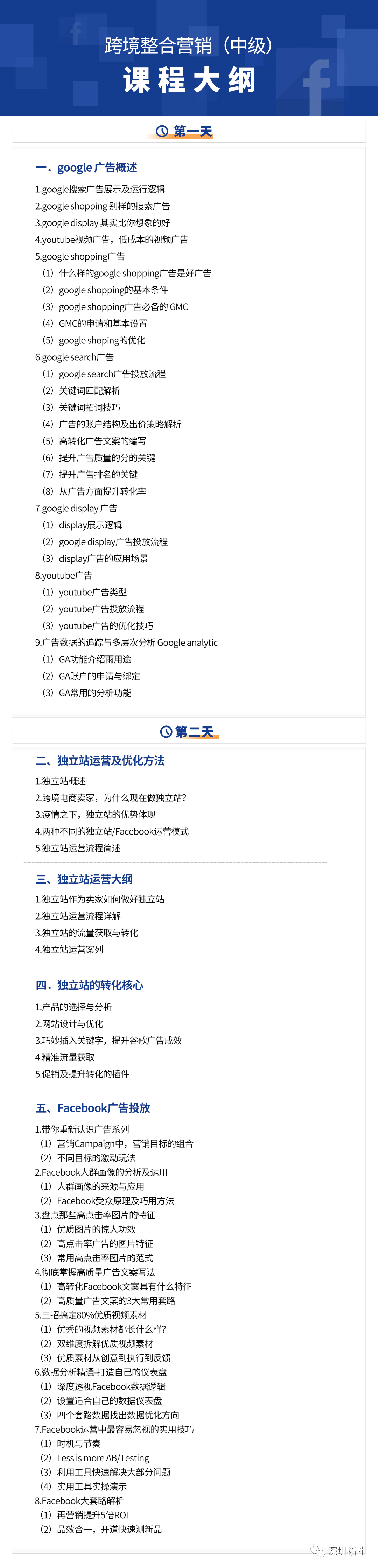 2021年9月,我們將帶著全新的整合營(yíng)銷中級(jí)班再次與大家見(jiàn)面!新升級(jí)的中級(jí)班依然保持Facebook+Google+Shopify三大核心模塊的內(nèi)容特色,增強(qiáng)廣告運(yùn)營(yíng)及投放技巧的比重。以期最大限度地幫助學(xué)員提高多渠道廣告投放能力和獨(dú)立站運(yùn)營(yíng)能力,系統(tǒng)建立跨境營(yíng)銷知識(shí)體系。