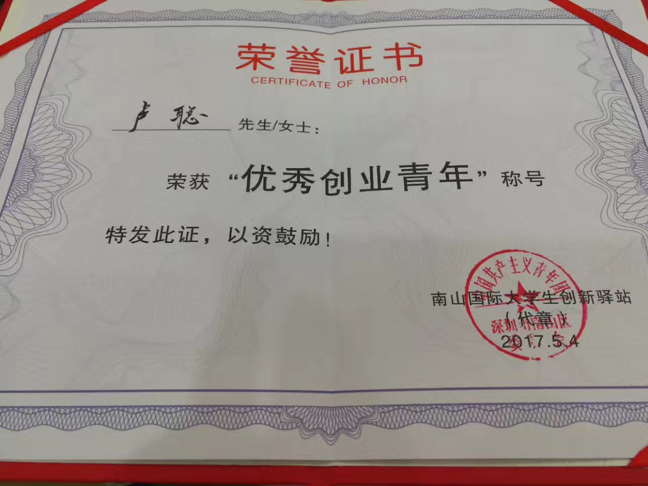 (2)5月4號,或南山區(qū)團委頒發(fā)的“優(yōu)秀創(chuàng)業(yè)青年”
