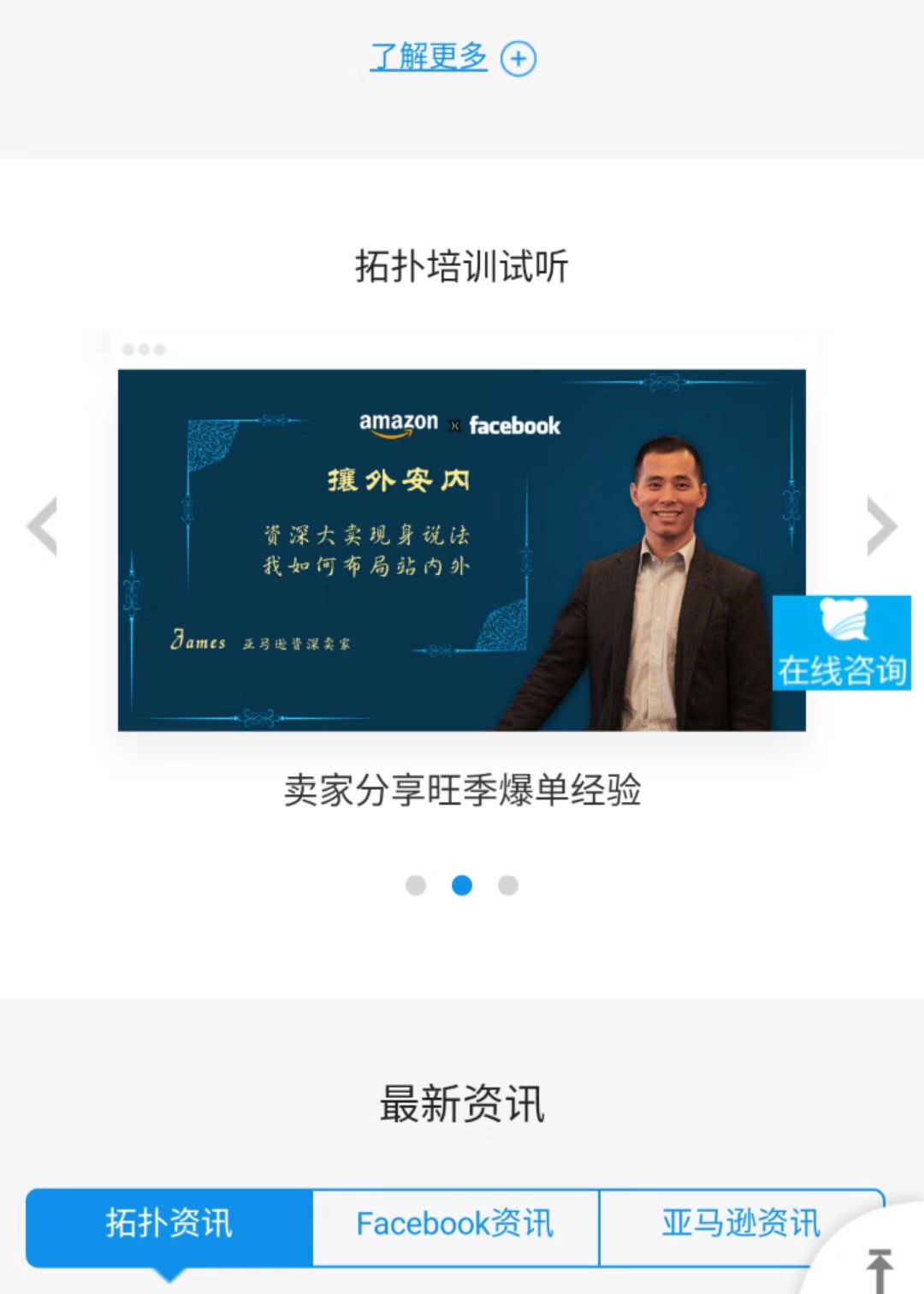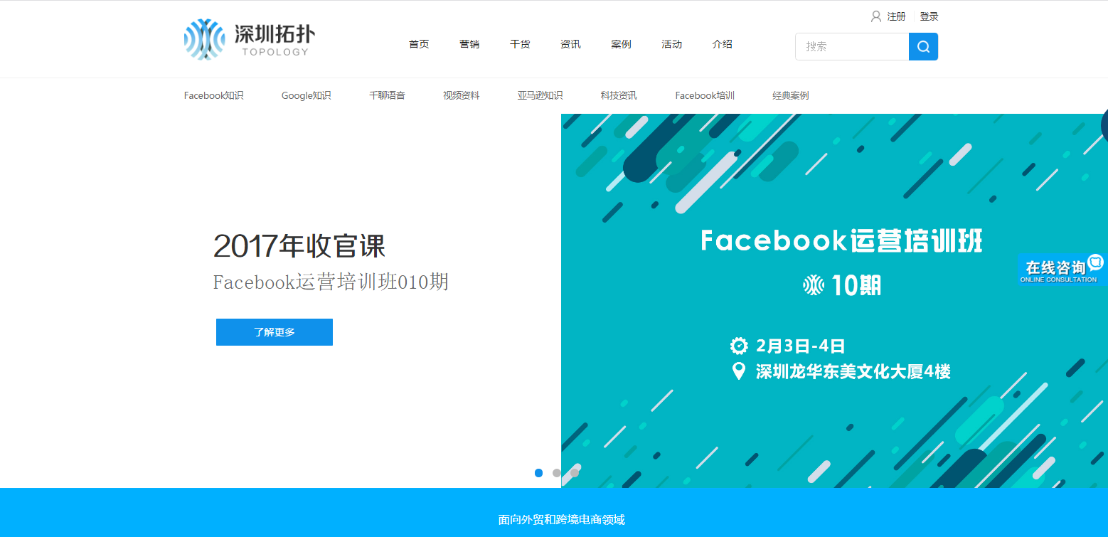 深圳拓撲官網(wǎng)的內(nèi)容結(jié)構(gòu)已經(jīng)上線,用戶可以在官網(wǎng)上獲取大量關于Facebook營銷的干貨、資訊、活動信息以及亞馬遜相關主題內(nèi)容等。