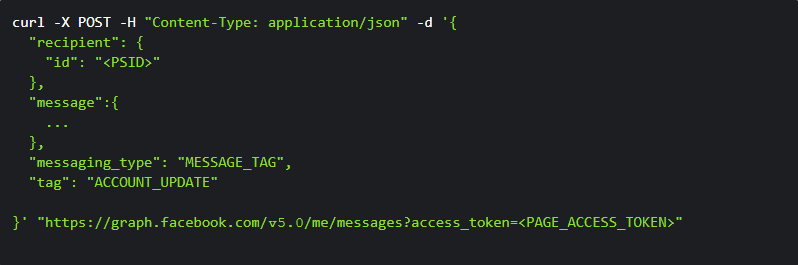 要使用Send API發(fā)送帶標(biāo)簽的消息,請(qǐng)像往常一樣發(fā)送一條消息,并將tag屬性附加到POST請(qǐng)求的正文中: