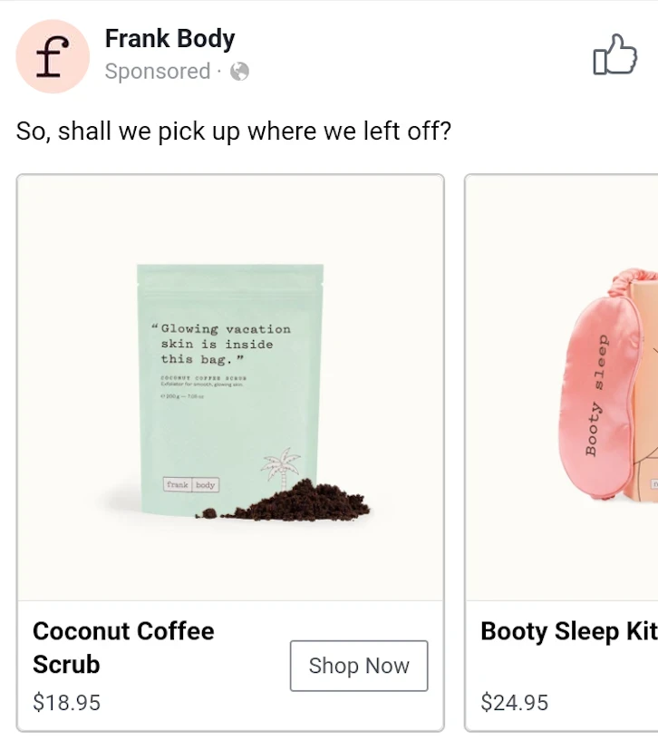 投放重定向廣告時,你會將廣告發(fā)送給曾經(jīng)訪問過你的網(wǎng)站的用戶。這些廣告可以根據(jù)他們的行為進行個性化設(shè)置。以下就是 Frank Body 重定向廣告的示例。