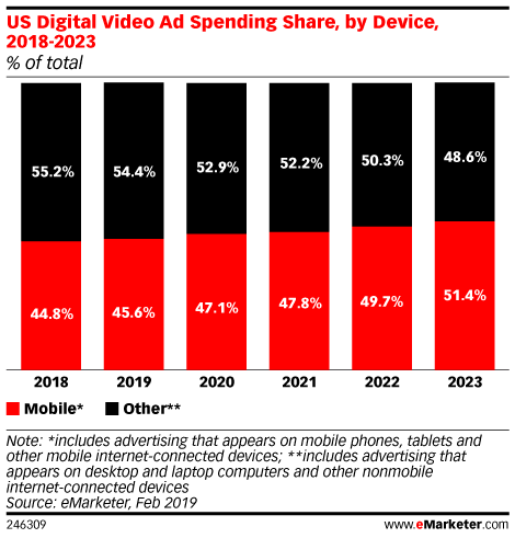 據(jù)估計(jì),2019年美國廣告商將在移動視頻廣告上花費(fèi)164.1億美元(占數(shù)字視頻廣告總支出的45.6%),在其它的視頻廣告上花費(fèi)195.9億美元。