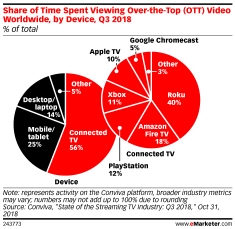 根據(jù)平臺Conviva 2018年10月的數(shù)據(jù),部分含有廣告的內(nèi)容雖然可在移動設(shè)備上觀看,但是在聯(lián)網(wǎng)電視觀看OTT視頻的時(shí)間占全球觀看時(shí)長的56%。