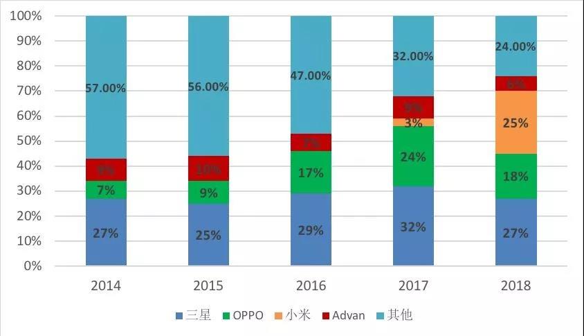 表1- 1 2014-2018印尼智能手機(jī)市場(chǎng)份額分布圖