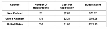盡管美國每次注冊(cè)的價(jià)格為1.88美元,但每位觀眾的轉(zhuǎn)化次數(shù)很少,而且美國的額外注冊(cè)產(chǎn)生的費(fèi)用可能比從其他國家/地區(qū)獲得價(jià)格適中的成本要高。