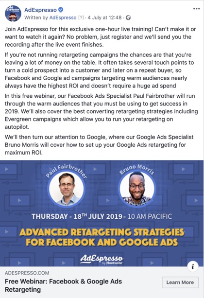 廣告系列設(shè)置的關(guān)鍵要素是受眾,讓CBO能夠在不同的CPA(行動(dòng)轉(zhuǎn)化成本)的基礎(chǔ)上來處理不同的受眾規(guī)模,我們大概就能看出效果了。因此,我們根據(jù)以前的webinar人員中注冊(cè)地為美國,英國和新西蘭的群體,創(chuàng)建了1%相似的受眾群體。