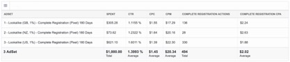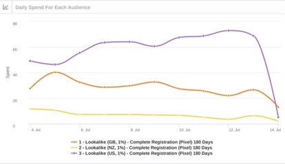 我們可以看到,每天沒有很大的波動(dòng),相反,Facebook首先根據(jù)受眾群體的規(guī)模給了所有人合理的預(yù)算。顯而易見,美國的CPA最低,F(xiàn)acebook通過將更多預(yù)算轉(zhuǎn)移到美國而不是英國和新西蘭,從而正確地優(yōu)化了廣告系列:
