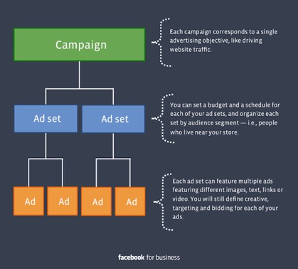 使用CBO時(shí),由于預(yù)算是在廣告系列這一級(jí)設(shè)置,因此廣告主獲得的控制較少,然后Facebook可自行決定為每個(gè)廣告組分配多少預(yù)算。下圖為Facebook廣告層級(jí)結(jié)構(gòu),CBO將預(yù)算從廣告組級(jí)別(藍(lán)色框)調(diào)整到廣告系列級(jí)別(綠色框)。
