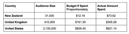 下表顯示,F(xiàn)acebook不僅僅是根據(jù)受眾群體規(guī)模分配預(yù)算,它還向新西蘭和英國提供了額外的資金。但這不是說是將預(yù)算平均分配給各個(gè)國家。