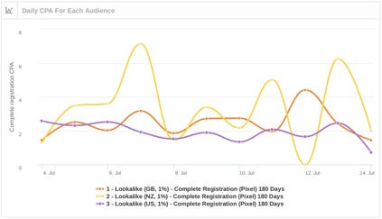 讓我們將注意力轉(zhuǎn)移到每日CPA費(fèi)率上(下圖),可以看到,第一天新西蘭和英國取得了最佳效果。此后,美國的CPA(紫色線)一直保持穩(wěn)定,結(jié)果相當(dāng)穩(wěn)定。新西蘭的每日變化很大,大概是每日預(yù)算較小。
