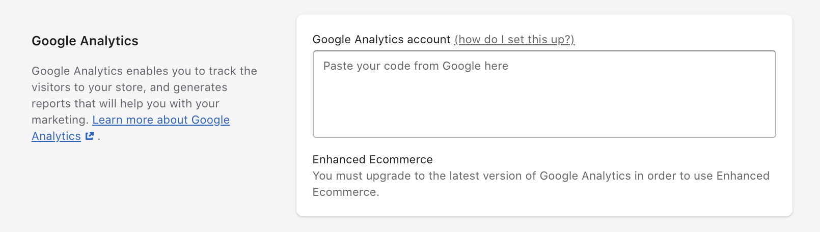 如果你在偏好設置頁面的 Google Analytics 部分中未看到跟蹤代碼,并且你的 theme.liquid 文件中沒有 Google Analytics 跟蹤代碼,則你的網(wǎng)站未啟用 Google Analytics。請繼續(xù)執(zhí)行“步驟 2:獲取 Google 賬號”。