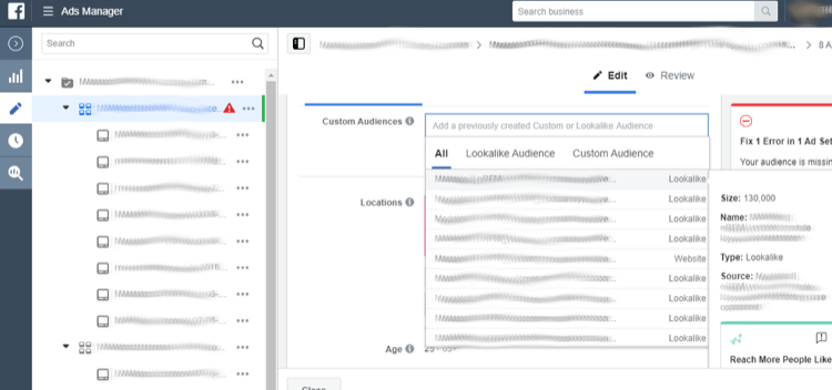 下一步是根據關鍵績效指標(KPI)來確定效果最好的自定義受眾群體。然后,你將根據每個最佳的自定義受眾群體創(chuàng)建低百分比的相似度,并將它們定位在同一廣告組中。這些“混合”類似受眾中的每一個都將是超級類似受眾。