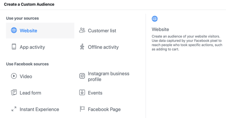 在“創(chuàng)建自定義受眾”窗口中,選擇“網站”作為來源。