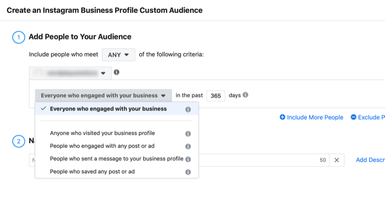 在創(chuàng)建Facebook和Instagram主頁管理人員、廣告參與人員以及視頻查看者的自定義受眾時,你可以延長時間范圍以包括過去365天的數據。