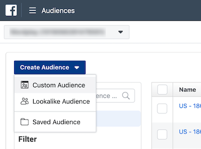 完成此操作后,轉到Facebook Ads Manager中的“受眾群體”以創(chuàng)建你的第一個自定義受眾群體。點擊創(chuàng)建受眾群體下拉菜單,然后選擇自定義受眾群體。