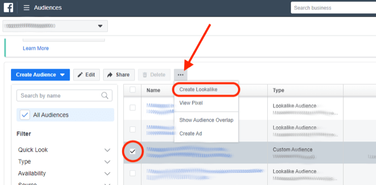 現在,轉到廣告管理器中的“受眾群體”,根據你的每個主要自定義受眾群體創(chuàng)建低百分比的外觀。選擇你的第一個自定義受眾,然后點擊帶有三個點的按鈕。從下拉菜單中選擇“創(chuàng)建外觀”。