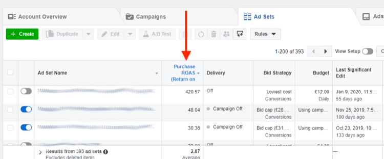 要確定你當前效果最好的廣告組,請打開Facebook Ads Manager,然后轉到“廣告組”標簽。為最重要的指標(例如ROAS)添加一列,并按該列表對列表進行排序。