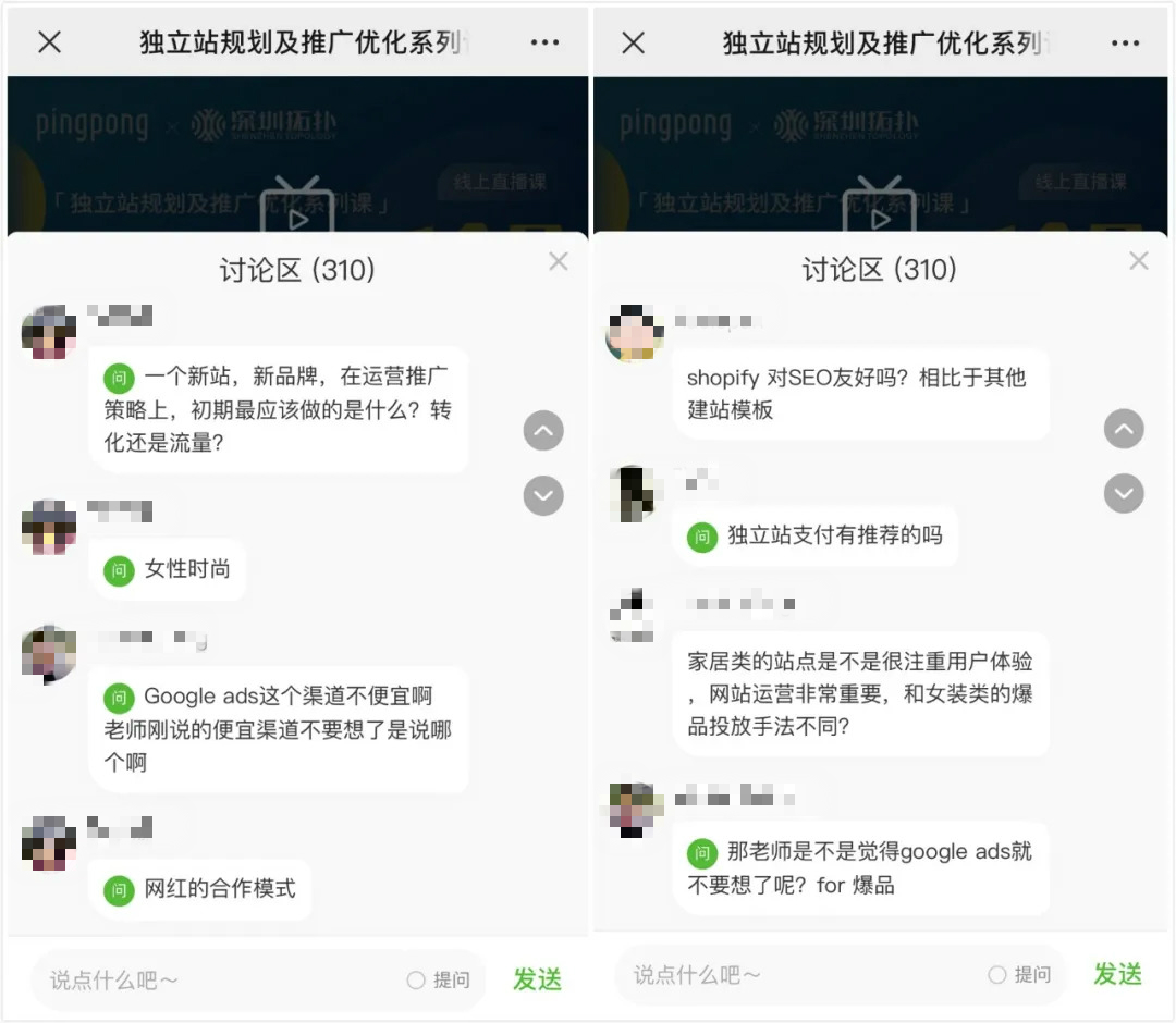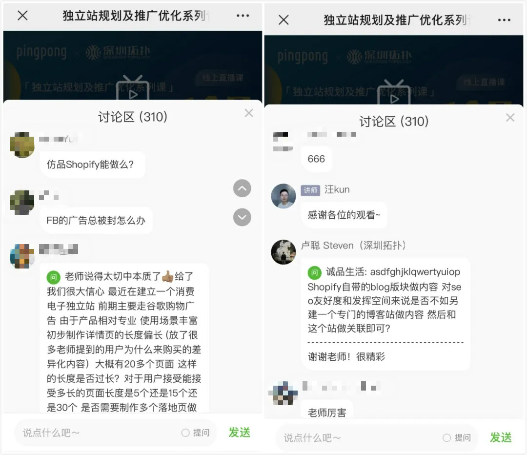 William在課程中與大家分享了自己多年的Shopify運(yùn)營(yíng)經(jīng)驗(yàn),講解如何從零開啟獨(dú)立站,并使用Google+ Facebook+ Email組合出擊。即使當(dāng)前是在特殊時(shí)期,大家的學(xué)習(xí)熱情依舊高漲,該場(chǎng)直播共有1151人次收看,討論區(qū)反響熱烈,累計(jì)互動(dòng)310次。