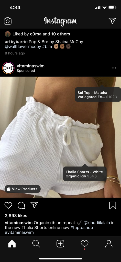 例如,Vitamin A泳裝使用可購(gòu)買的Instagram廣告。當(dāng)某人點(diǎn)擊促銷的標(biāo)簽(顯示產(chǎn)品名稱和價(jià)格)時(shí),他們將被直接帶到維生素A的產(chǎn)品頁面。