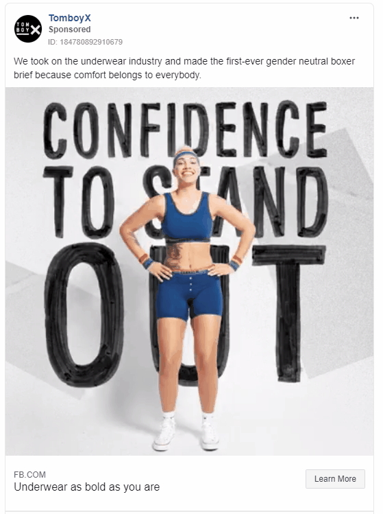 TomboyX是一家生產(chǎn)文胸和中性內(nèi)褲的公司,通過關(guān)注每個(gè)人的共同點(diǎn):想要自在,與觀眾建立聯(lián)系。該公司的廣告將所有當(dāng)前和潛在客戶作為一個(gè)共同的群體,不去考慮性別規(guī)范,反而指出“舒適屬于每個(gè)人”。