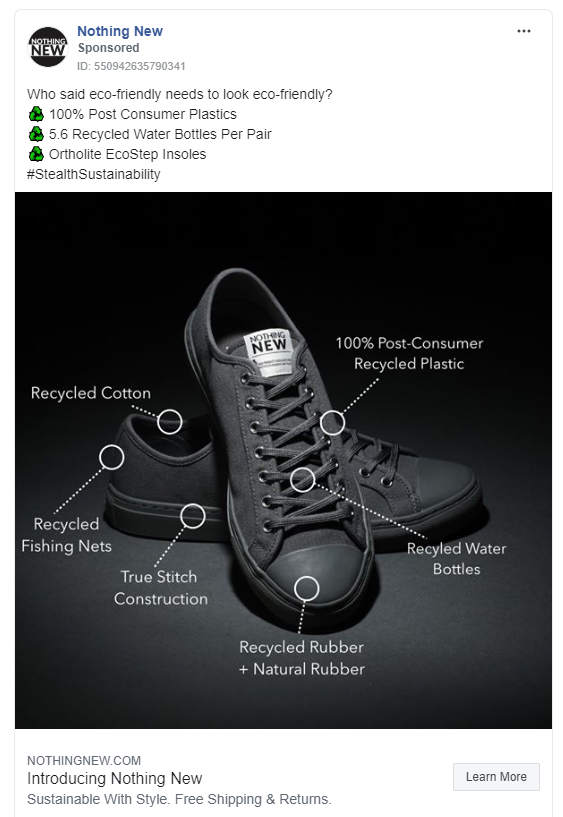 鞋類公司Nothing New使用Instagram突出了其可持續(xù)性目標(biāo),并展示了其產(chǎn)品如何成為該目標(biāo)的一部分。標(biāo)題提供了具體的證據(jù),說明該產(chǎn)品由100%的消費(fèi)后塑料制成,證明這雙特色鞋遵循了公司的使命。