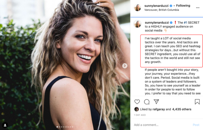 “多年來,我教過很多社交媒體策略。而且戰(zhàn)術(shù)很棒。我可以花幾天的時(shí)間教你SEO和主題標(biāo)簽策略……但是如果沒有這種SECRET成分,你可以使用世界上所有的策略,但仍然看不到任何增長。”