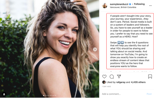 “滑動????以查看6個(gè)問題,這些問題將幫助你確定應(yīng)在社交媒體上共享和討論的內(nèi)容的根源。明天在YouTube上,我將向你確切演示如何創(chuàng)建源源不斷的內(nèi)容創(chuàng)意,使你成為每個(gè)人都想效仿的英雄。”